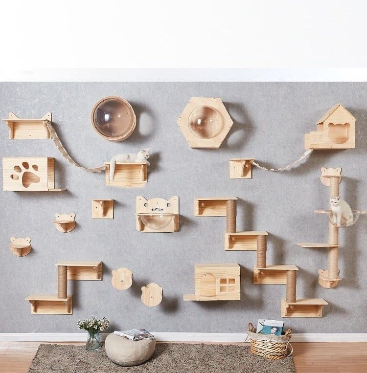 فضای داخلی: ترکیبی از مبلمان چوبی حیوانات خانگی که روی دیوار نصب می شوند، برای فضاهای داخلی خانه مناسب است و یک منطقه سرگرمی رنگارنگ برای گربه شما فراهم می کند.قفسه صخره نوردی گربه روی دیوار فضای زمین را اشغال نمی کند و باعث صرفه جویی در فضا و ایجاد فضای فعالیت ویژه برای گربه می شود.
