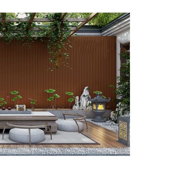 نرده ها و دیوارهای جداکننده: از روکش چوبی فضای باز می توان برای تزئین نرده ها و دیوارهای جداکننده استفاده کرد و زیبایی نرده و حفظ حریم دیوار جداکننده را افزایش داد.در عین حال، طراحی توری نیز تهویه و نفوذ نور را تسهیل می کند.